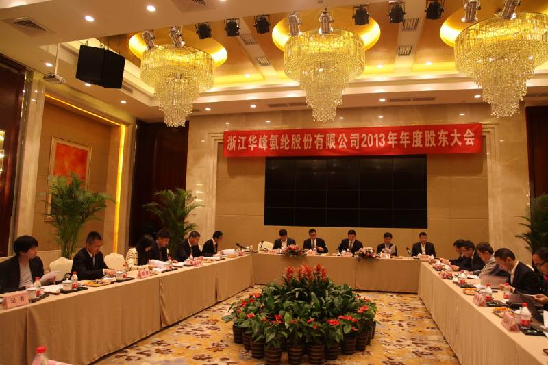 4月21日上午,華峰氨綸在瑞安國際大酒店召開了2013年年度股東大會,公司股東及股東代表共15人參加會議,獨(dú)立董事端小平、公司部分監(jiān)事、董事及高管列席本次會議,會議由董事長楊從登主持。會議審議并通過了2013年度董事會工作報(bào)告、監(jiān)事會工作報(bào)告、財(cái)務(wù)決算報(bào)告、年度利潤分配預(yù)案和續(xù)聘立信會計(jì)事務(wù)所議案等七項(xiàng)議案。