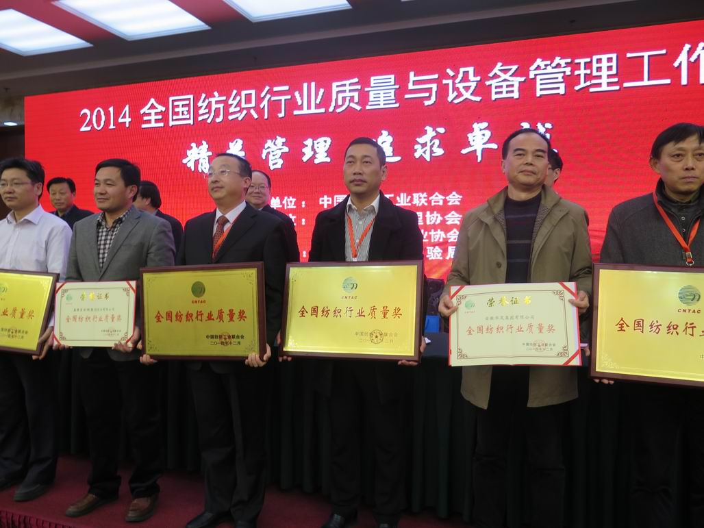 12月25日,2014年全國紡織行業(yè)質量與設備管理工作會在山東省濟南市召開,來自工信部、中紡聯(lián)與紡織各行業(yè)協(xié)會相關負責人及企業(yè)代表200余人參加了會議,華峰氨綸榮獲第三屆“全國紡織行業(yè)質量獎”。