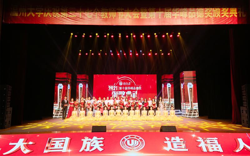 9月10日下午,溫州大學(xué)慶祝第37個(gè)教師節(jié)大會(huì)暨第十屆“華峰品德獎(jiǎng)”頒獎(jiǎng)典禮在育英大禮堂舉行,近千名溫大師生代表齊聚一堂,共同聆聽獲獎(jiǎng)代表的感人事跡,共同見證溫大“品德之花”再次綻放。