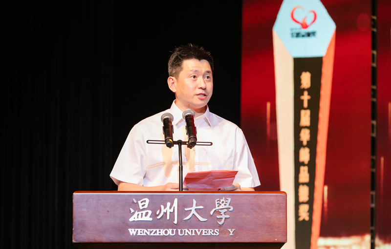 兢兢業(yè)業(yè)、愛崗敬業(yè)的教師,品學(xué)兼優(yōu)、自強(qiáng)不息的學(xué)子,勇于探索、刻苦鉆研的專家學(xué)者,還有熱心公益、傳遞關(guān)愛的志愿者……十位出身不同、經(jīng)歷各異的“溫大人”,依次登上領(lǐng)獎(jiǎng)舞臺(tái)。不同的面龐述說著不同的故事,卻用他們的敬業(yè)之志、篤學(xué)之風(fēng)、創(chuàng)新之勇和大愛之心,向臺(tái)下觀眾傳遞著相同的感動(dòng)。溫州大學(xué)黨委副書記、校長趙敏,華峰集團(tuán)董事長尤飛宇、副總裁潘基礎(chǔ)等校企領(lǐng)導(dǎo)為獲獎(jiǎng)?wù)哳C獎(jiǎng)。