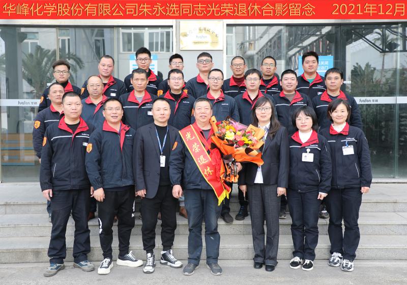 “12月24日,是寓意平安的傍晚,也是朱永選在崗最后一個(gè)月內(nèi)的特殊日子。1998年8月入職華峰,他與企業(yè)風(fēng)雨同舟23年,工作兢兢業(yè)業(yè)、任勞任怨,他是華峰發(fā)展的奉獻(xiàn)者和見證者,一路前行,感恩有你……”在主持人江斌斌情真意深的致謝詞中,制造部動(dòng)力供熱團(tuán)隊(duì)二十來位員工為身邊的老同事朱永選舉行光榮退休歡送會(huì),工會(huì)主席李娟、制造部經(jīng)理葉國(guó)建、工會(huì)副主席吳海峰和陳永武等一同參加本次歡送會(huì)。當(dāng)日的歡送會(huì),也是華峰化學(xué)工會(huì)聯(lián)合基層團(tuán)隊(duì)對(duì)員工關(guān)懷做出的一次創(chuàng)新舉措,更是對(duì)退休老員工最深情的關(guān)愛。