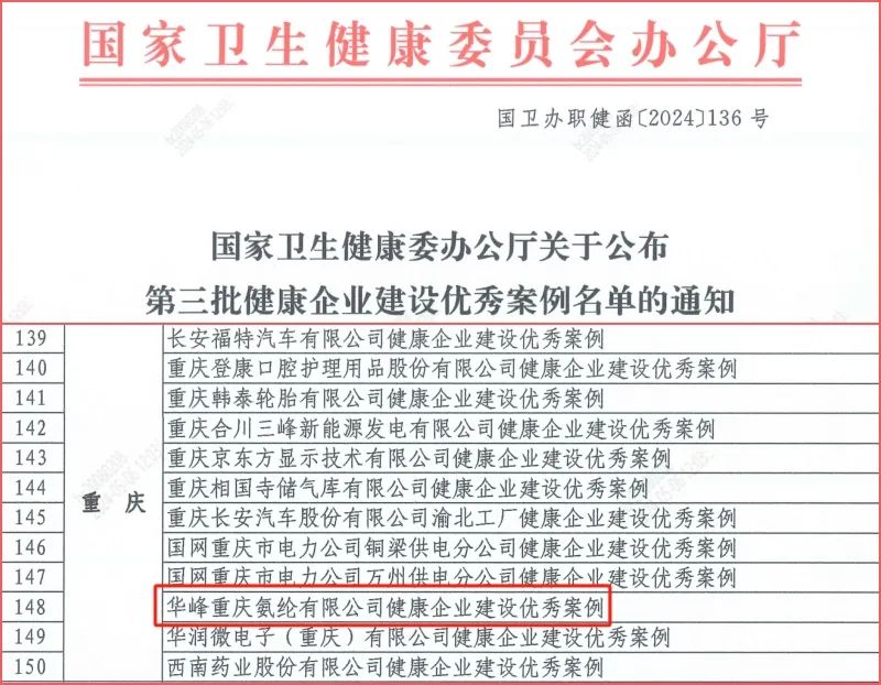 日前,國家衛(wèi)生健康委辦公廳公布第三批健康企業(yè)建設(shè)優(yōu)秀案例名單,華峰重慶氨綸有限公司成功入選,是重慶市本次獲評12家企業(yè)之一,也是涪陵區(qū)歷年以來唯一上榜的企業(yè)。